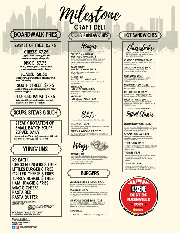 Inspired by the delis, food markets and strip mall restaurants from the Northeast region of the U.S, they bring that honest, cozy cuisine that is crafted with time, love, and lots of garlic & herbs. Middle TN, here comes a Milestone you will be proud to call your neighborhood destination!